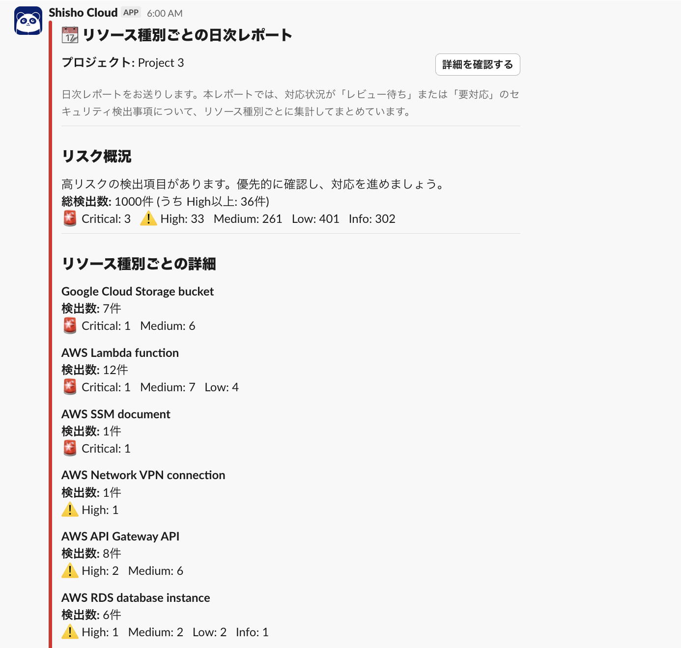 Shisho Cloud allows you to flexibly control the timing and content of notifications through workflows. For ease of use without complex configuration, a default notification workflow is provided, which sends notifications based on the severity of detected issues.
